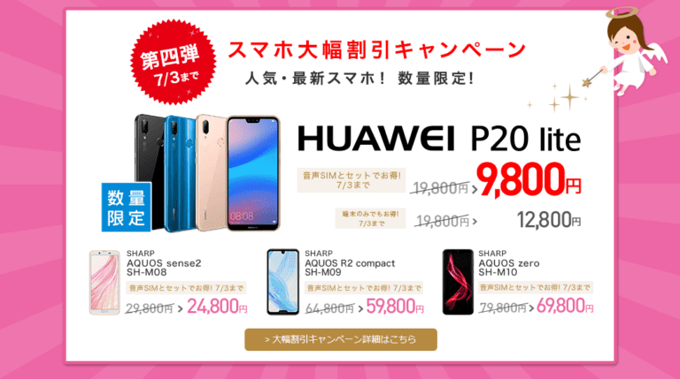 この中でもなんと一括9,800円!24回の分割で430円と超破格になるHuawei P20 lite(ピートゥエンティライト)が目玉になるでしょう。